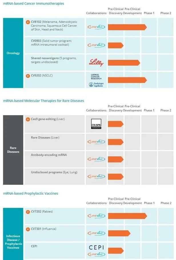 除了GSK的突击入股,CureVac还和赛诺菲、强生(杨森制药)、勃林格殷格翰、礼来等保持着合作。相较两位竞争对手,CureVac的前期研发过程并不算顺利,作为握有最早进入II期临床的产品公司,CureVac的肿瘤疫苗CV9104在2017年宣布未能达到主要终点而终止研发,这也直接导致了公司整个研发布局的相对滞后和公司发展的相对谨慎而缓慢。这也从另一方面显示了mRNA技术药物的风险。