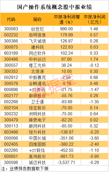 国产操作系统概念股中,22股已发布了中报或业绩预告,创世纪、启明星辰、飞天诚信、建科院、网达软件上半年净利润或预告净利润翻番。