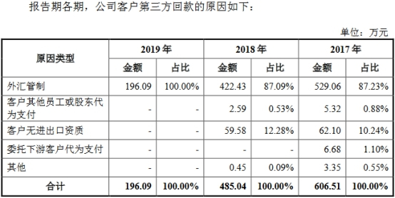 该公司称,报告期内,客户通过第三方付款的情形,主要系外汇管制原因,公司部分客户所在国受到经济制裁或当地政府出于平衡国际支出的考虑,对本国外汇进出实行审批和限制,部分客户出于便捷考虑,在与公司的交易中采用了第三方回款的方式,存在合理性。第三方回款的付款方与发行人及其控股股东、实际控制人、董事、监事、高级管理人员或其他关联方不存在关联关系或利益安排的情形。报告期内,公司不存在因第三方回款导致货款归属纠纷的情况。