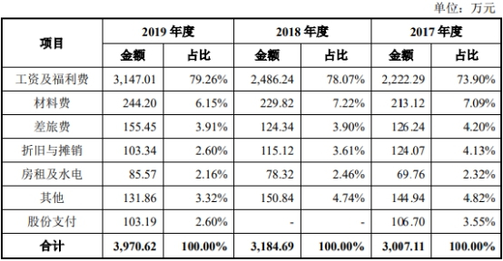 2017年及2019年,步科股份研发人员工资及福利费分别为2222.29万元、2486.24万元和3147.01万元,占研发费用的比例分别为73.90%、78.07%和79.26%;材料费分别为213.12万元、229.82万元和244.20万元,占研发费用的比例分别为7.09%、7.22%和6.15%;差旅费分别为126.24万元、124.34万元和155.45万元,占研发费用的比例分别为4.20%、3.90%和3.91%;折旧与摊销费用分别为124.07万元、115.12万元和103.24万元,占研发费用的比例分别为4.13%、3.61%和2.60%;房租及水电费用分别为69.76万元、78.32万元和85.57万元,占研发费用的比例分别为2.32%、2.46%和2.16%;其他费用分别为144.94万元、150.84万元和131.86万元,占研发费用的比例分别为4.82%、4.74%和3.32%。