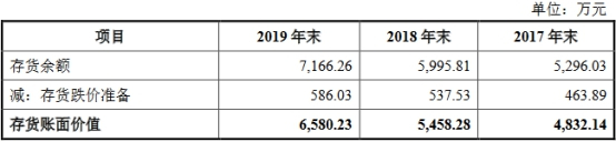 2017年至2019年,该公司存货跌价准备分别为463.89万元、537.53万元和586.03万元,占存货账面余额的比例分别为8.76%、8.97%和8.18%。同期,同行业可比上市公司计提的平均存货跌价准备分别为1.79%、2.14%和6.17%。