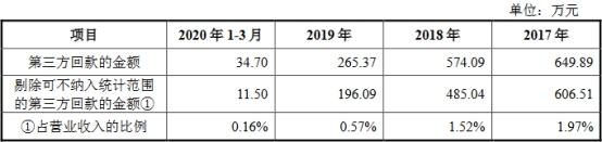 2017年、2018年、2019年和2020年1-3月,步科股份第三方回款的金额分别为649.89万元、574.09万元、265.37万元和34.70万元,剔除可不纳入统计范围的第三方回款的金额分别为606.51万元、485.04万元、196.09万元和11.50万元,占营业收入的比例分别为1.97%、1.52%、0.57%和0.16%。