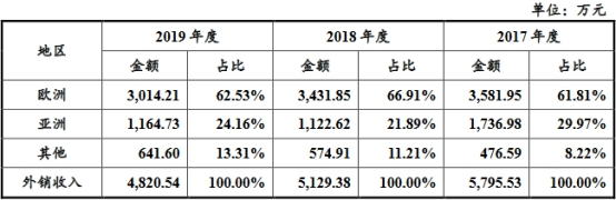 步科股份存在境外销售情形。2017年至2019年,其外销收入分别为5795.53万元、5129.38万元和4820.54万元,占比分别为18.95%、16.19%、14.03%。
