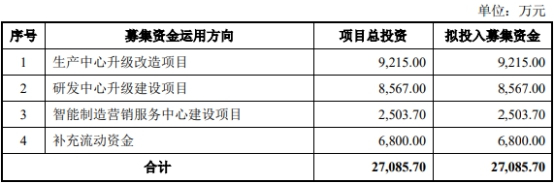 步科股份本次拟公开发行股票数量不超过2100万股,不低于发行后总股本的25%,发行后总股本不超过8400万股。其拟募集资金2.71亿元,其中8215万元拟用于生产中心升级改造项目,8567万元拟用于研发中心升级建设项目,2503.70万元拟用于智能制造营销服务中心建设项目,6800万元拟用于补充流动资金。