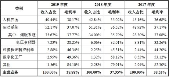 2013年至2019年,该公司人机界面毛利率分别为47.06%、45.83%、40.20%、39.13%、36.68%、35.02%和38.17%;伺服系统产品毛利率分别为34.28%、32.54%、36.26%、39.80%、37.08%、35.79%和37.77%;低压变频器毛利率分别为18.38%、17.72%、25.04%、31.67%、32.26%、32.01%和28.25%。