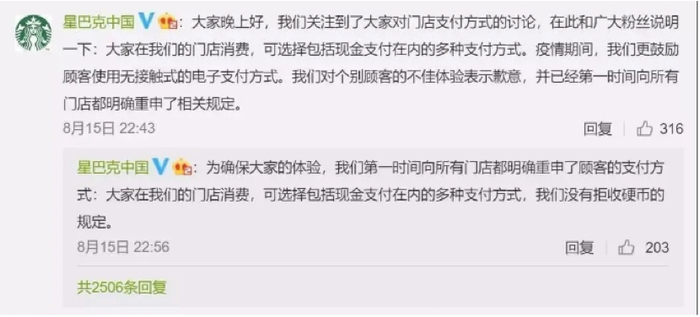 对此,@星巴克中国在给网友的评论中回应称,在门店消费可选择包括现金支付在内的多种支付方式,没有拒收硬币的规定,疫情期间更鼓励顾客使用无接触式的电子支付方式,对个别顾客的不佳体验表示歉意,并已经第一时间向所有门店都明确重申了相关规定。