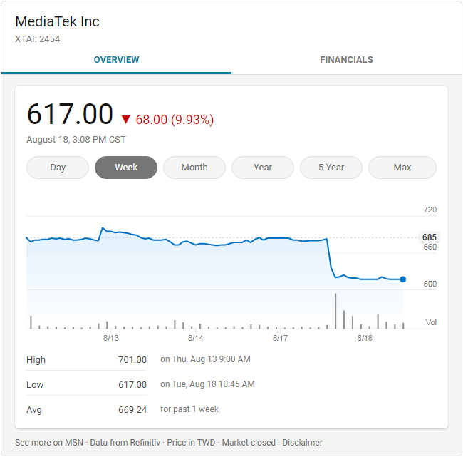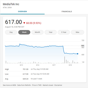 消息发布后,在台北股市,联发科股价周二跌停,下跌9.93%,该股今年已经上涨54%,此前其评级被瑞士信贷(Credit Suisse)下调至“中性”。
