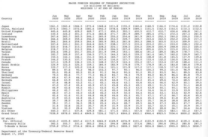 其中,日本仍是美债最大的海外持有人,其持仓略升9亿美元至1.26万亿美元。然而,第二大“债主”的中国持有量则下降93亿美元至1.07万亿美元,为降幅最大的国家。数据也显示,自去年以来,中国的持仓量持续小幅下滑,2019年基本都在1.12万亿美元附近波动。