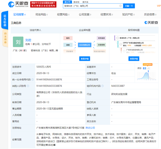 哲库科技(广东)有限公司成立,该公司注册资本5000万人民币,由OPPO广东移动通信有限公司全资持股。经营范围包括设计、开发和销售半导体、芯片等。