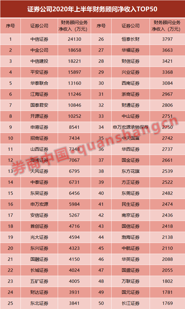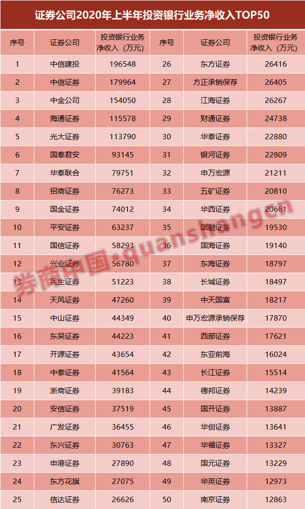不过,投行业务受“风险因素”的影响也比较明显。例如,在2019年上半年榜单中,广发证券以4.81亿元的水平排在行业第九名。受康美药业等事件“拖累”,广发证券在2020年上半年仅实现3.65亿元投行净收入,跌出前20名。在今年7月处罚“靴子”落地后,广发证券投行业务被按下暂停键,这将对其全年排名产生更多影响。
