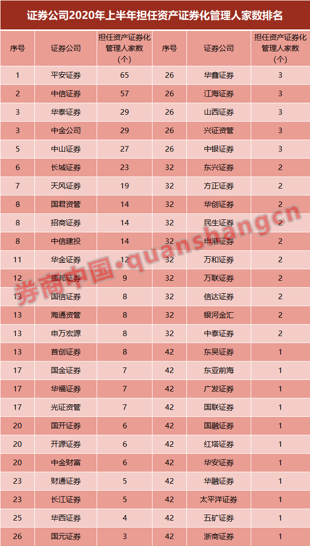 2020年上半年,平安证券的ABS业务可算是一枝独秀,当期担任ABS管理人数量产品多达65个,跃居行业首位。中信证券为57个,居于行业第二位。此外,华泰证券、中金公司等9家券商管理ABS产品也在10个以上。
