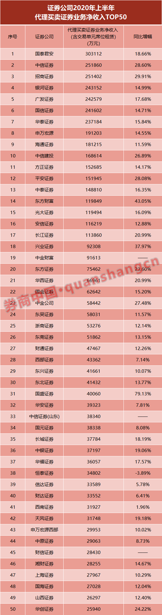具体来看,国泰君安上半年实现代买卖证券收入(含席位租赁)为30.31亿元,同比增加18.66%;中信证券、招商证券分别实现该项收入超过25亿元,同比增幅均接近30%,行业排名分别为第2、3位次。