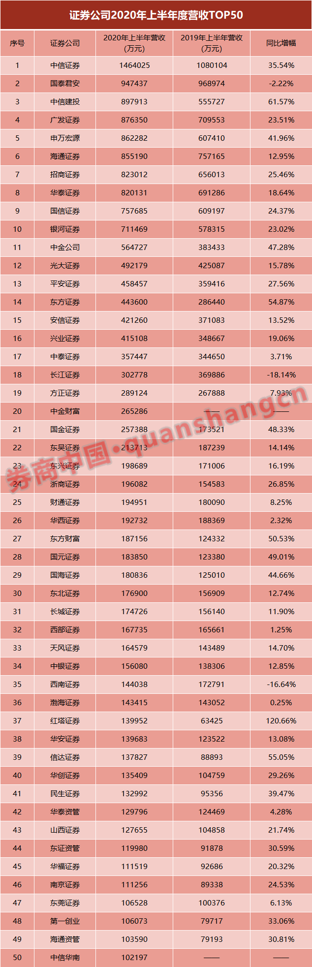 就行业排名前五十的券商营收规模来看,中信建投证券为同比增幅最高的券商,东方证券、信达证券、东方财富证券的营收增幅均超过50%。
