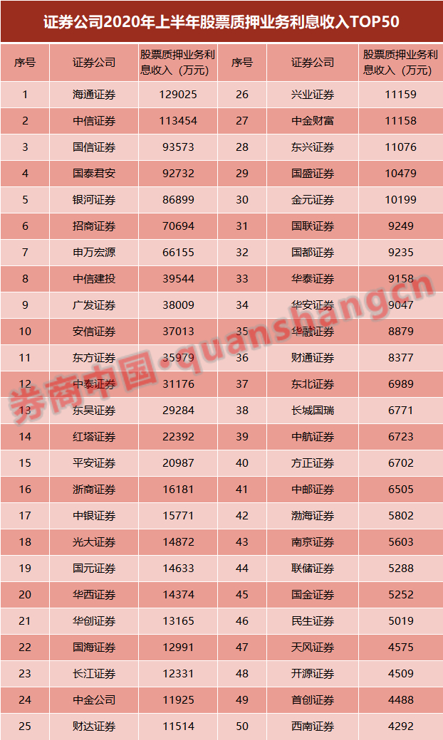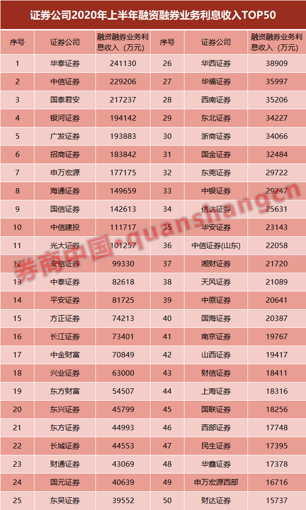 就2020年上半年的排名情况来看,融资业务利息收入排名变化较为明显。不过,整体上仍是资本雄厚的大型券商排名靠前。