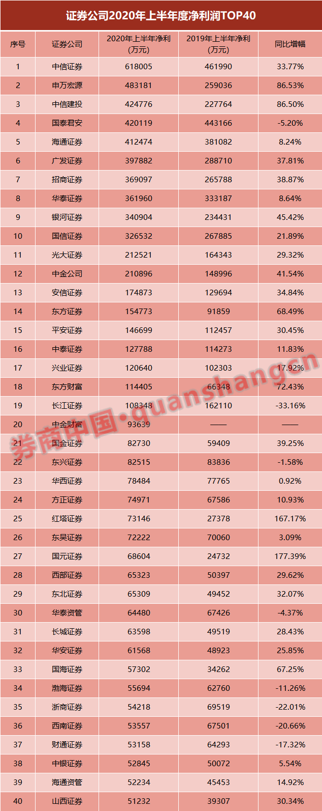 中信证券以61.8亿元的净利润位居行业第一,同比增幅33.77%;申万宏源证券和中信建投证券净利润分别为48.32亿元和42.48亿元,同比增幅均超86%;国泰君安和海通证券的净利润分别为42亿元和41.25亿元,前者下滑5%,后者增长8%,上半年排名第4名和第5名。