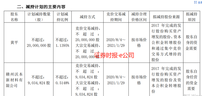 7月14日,盛和资源发布公告,以自身资金需要为由,在2020年8月4日~2021年1月29日期间,上市公司股东、董事、总经理黄平及其一致行动人赣州沃本新材料投资有限公司(以下简称沃本新材),将通过竞价和大宗交易的方式,合计减持盛和资源不超过2903.48万股。彼时,黄平持有盛和资源股份1.19亿股,占该上市公司总股本的6.79%;沃本新材则持有盛和资源903.48万股,占其总股本的 0.51%。