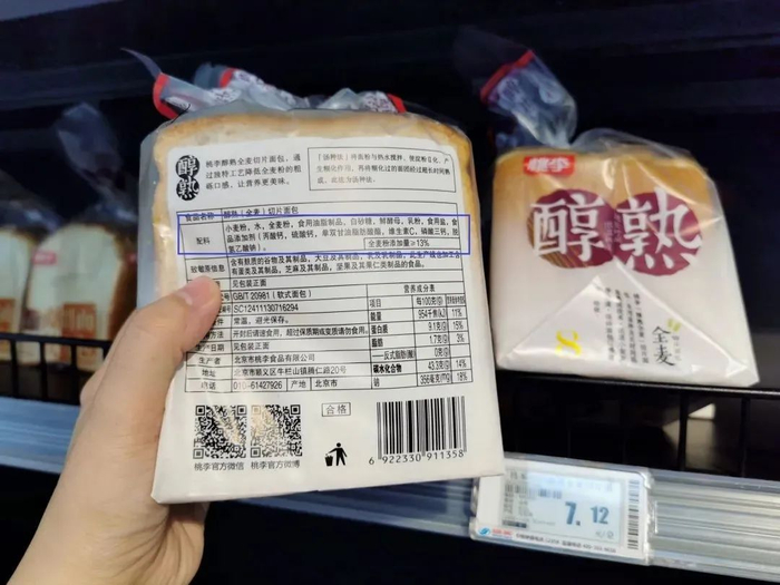 但值得注意的是,目前国内市场还没有“全麦含量”的统一规范,因此在一定程度上说,全麦“含量”的高低,全凭商家自己说了算。市面上一些看着像全麦面包,其实是额外添加糖浆、焦糖色素,为了让面包呈淡褐色,看起来像是全麦制的。另外,为了改善这些口感,很多面包会添加品质改良剂、添加物等软化面包。