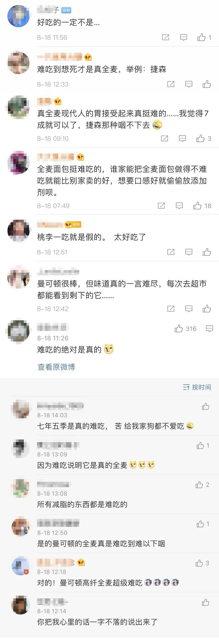 微博上,就有不少网友表达了对全麦面包的“嫌弃”: