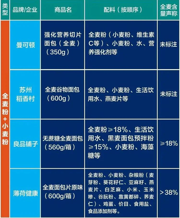 有4款产品以全麦粉为主料,但同时添加了小麦粉成分,分别是在曼可顿强化营养切片面包(全麦)、苏州稻香村全麦谷物面包、良品铺子无蔗糖全麦面包、薄荷健康原味全麦面包片,在这些产品的配料表中,全麦粉均位列第一位,但同时添加了小麦粉或含有小麦粉的预拌粉成分。