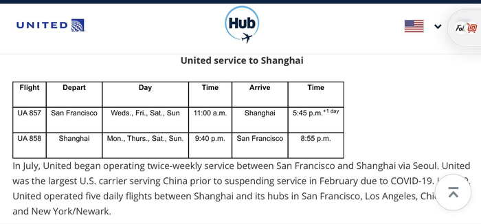 美联航此前每周执飞两班旧金山-上海浦东的往返航线,从2020年9月4日开始,该航线将增加到每周四班,分别在周三、周五、周六和周日从旧金山飞往上海,周一、周四、周六和周日由上海返回旧金山,机型为波音777-300ER飞机。