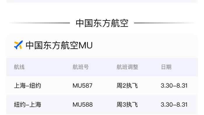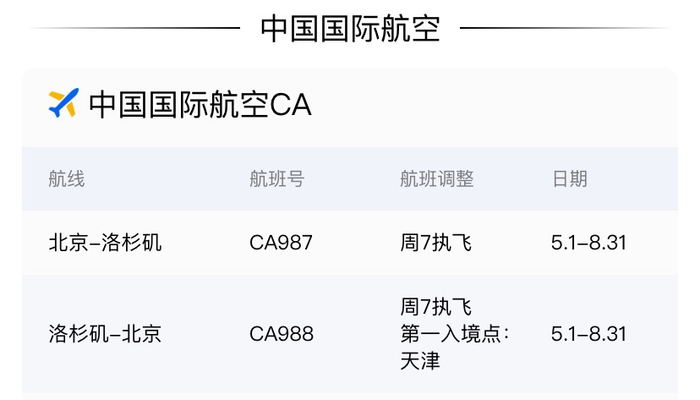 记者注意到,根据航班管家汇总的各航司国际航线安排,中国国航北京-洛杉矶航线适用日期为5月1日至8月31日;东航上海-纽约航线适用日期为3月30日至8月31日;