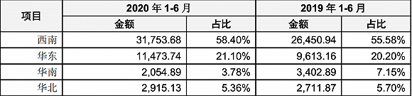 从半年报显示的销售区域来看,有友食品将国内市场划分为西南、华东、华中、东北、华北、西北和华南七个大区,其中超过一半的收入来自大本营西南,其次是华东地区。