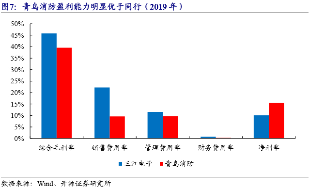 与同行业可比公司对比,青鸟消防盈利能力更强。同样在A股上市的三江电子作为公司主要的竞争对手之一,主营产品与青鸟消防重合度高,但三江电子主要采用直销模式,2019年其直销业务占比为93.99%。与青鸟消防经销模式相比,直销模式毛利率更高,2019年青鸟消防和三江电子毛利率分别为39.56%和45.80%。但公司渠道和成本管控能力卓越,2019年销售费用率和管理费用率分别为9.59%、9.65%,大幅优于三江电子的22.21%、11.53%。综合来看,2019年青鸟消防、三江电子销售净利率分别为15.50%、10.06%,青鸟消防盈利能力更强。