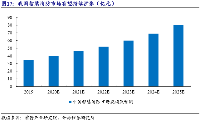 除了智能疏散业务的快速增长,公司还积极进军工业消防市场。根据金盾电子招股书披露的数据,2014年我国石化、冶金、电力、通讯等工业消防应用市场需求占消防产品总规模的38%,据此比例估算2019年我国工业消防市场空间约为333亿元。工业行业的火灾报警产品市场客户粘性高且需求刚性,同时产品标准也更高,目前大型工业企业主要使用国外品牌为主。近年来,青鸟消防积极进行工业火灾报警相关产品的研发和攻关,目前已布局的产品包括红外/紫外火焰探测器、探测绝缘性能式探测器、线性光束感烟探测器、图像型探测器、热解粒子感烟探测器、吸入式空气采样探测器等。凭借卓越的品牌效应和全国化的经销渠道优势,工业消防有望成为公司继智能疏散后又一大业务板块。此外,公司还前瞻性地布局智慧消防等新兴业务。智慧消防将各类消防安全设施连接在一起,并通过云端大数据分析实时监控火情,与传统消防体系相比响应更及时、精准。根据前瞻产业研究院数据,预计未来五年中国智慧消防投资增速有望保持在15%左右,到2025年智慧消防市场规模将达到80亿元左右。青鸟智慧消防平台利用物联网技术,将分散在各个建筑内部的消防报警系统、消防水系统等连成网络集中管理,实时监控消防设备运行状态,为消防主管部门加强主动消防安全管理和服务提供数据和应用支撑,有效降低火灾隐患。智慧消防得到了国务院、公安部等各级政府的支持,是消防行业发展的大势所趋,长期看有望成为公司新的业绩增长点。