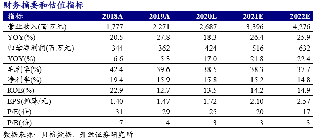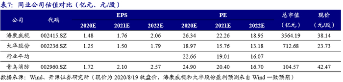 目前国内消防产品市场竞争格局仍然非常分散,在龙头市占率提高、中小企业快速出清的过程中,将不可避免的经历竞争加剧、盈利能力下降的阶段。另外,由于公司增长最快的智能疏散与防火门监控系统业务毛利率低于传统业务,同样将导致公司短期利润率下降。但是,随着公司体量的快速扩张,市占率达到较高水平后行业壁垒将明显提高,公司盈利能力也将保持稳定。综上,预计公司2020-2022年归母净利润分别为4.24/5.16/6.32亿元,对应EPS为1.72/2.10/2.57元,当前股价对应2020-2022年PE为25/20/17倍。由于目前A股已上市的消防产品行业相关公司仅青鸟消防、金盾股份和鼎信通讯三家,而后两家公司的消防产品业务占其营收比重低且盈利预测方面尚无万得一致预期,因此我们选择与消防产品行业属性类似的安防行业龙头海康威视和大华股份作为公司的可比公司。估值方面,公司当前PE与可比公司平均水平接近。但考虑到青鸟消防作为消防产品行业龙头市占率提升空间比安防行业更大且增速更快,公司目前估值水平仍然较低。首次覆盖,给予“买入”评级。