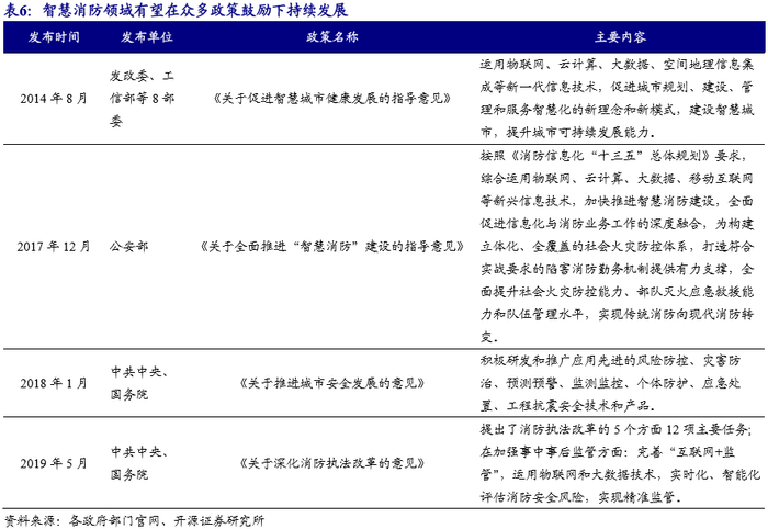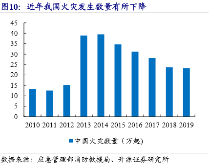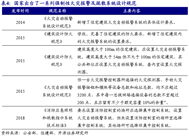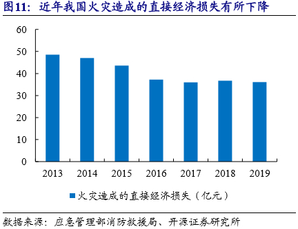 火灾对生命和财产安全威胁大,强制性政策助推消防产品渗透。根据消防救援局发布的全国火灾情况,2019年全国接报火灾23.3万起,死亡1335人,伤837人,直接财产损失36亿元。其中,高层建筑火灾呈多发之势,2019年高层建筑发生火灾6947起,同比上升10.6%;建筑工地发生火灾2926起,同比上升5.8%。此外,2019年城乡居民住宅火灾占总数的44.8%,共造成1045人死亡,占总数的78.3%,远超其他场所死亡人数总和。针对火灾对人民生命和财产安全造成的威胁,近年来各级政府出台了一系列政策和指导意见,对消防行业规范和产品稳定性提出了更高的要求,推动了各类消防产品在住宅建筑领域的渗透。例如,2015年新修订实施的《建筑设计防火规范》(GB 50016-2014)规定“建筑高度大于100m的住宅建筑,应设置火灾自动报警系统。建筑高度大于54m但不大于100m的住宅建筑,其公共部位应设置火灾自动报警系统,套内宜设置火灾探测器。建筑高度不大于54m的高层住宅建筑,其公共部位宜设置火灾自动报警系统。当设置需联动控制的消防设施时,公共部位应设置火灾自动报警系统。高层住宅建筑的公共部位应设置具有语音功能的火灾声警报器或应急广播。”除了自动消防报警系统等传统消防产品的渗透,政策还推动了智能疏散等产品应用的快速铺开。2018年7月10日住建部发布《消防应急照明和疏散指示系统技术标准》并于2019年3月1日起开始实施。该标准要求设置消防控制室的场所应选择集中控制系统;设置火灾自动报警系统,但未设置消防控制室的场所宜选择集中控制系统;其他场所可选择非集中控制系统。强制性消防安全政策的推行促进了消防体系的完善和消防意识的提高,有效降低了火灾对生命财产安全的威胁。2019年我国火灾发生数量以及造成的直接经济损失分别较2013年下降40.1%、34.3%。政策的强制性将继续推动消防产品渗透率的持续提升。
