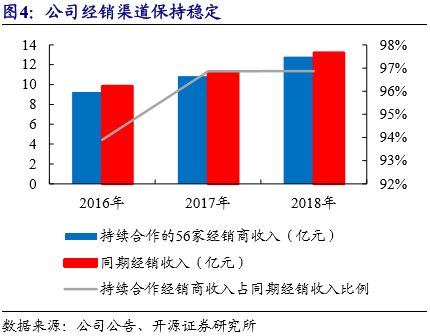 强品牌力叠加完善的全国性经销网络,公司主营业务收入快速增长。除了卓越的产品品质,公司还通过十余年的经营建立起了覆盖全国的经销网络。2019年公司通过经销商实现的经销收入占公司主营业务收入比重为74.30%,经销收入是公司最主要的收入来源。目前公司在全国各地拥有61家经销商,业务覆盖中国大陆除西藏地区外的绝大部分地区。公司与其中56家经销商保持长期稳定合作,2016-2018年其合计贡献公司经销收入的93.90%、96.86%、96.87%,占比稳中有升。强大的品牌力叠加完善的全国性经销网络,推动公司业绩持续高速增长。2015至2019年公司主营业务收入从9.53亿元增至22.71亿元,CAGR达24.25%;归母净利润从2.03亿元增至3.62亿元,CAGR达15.56%。