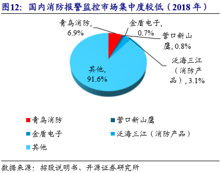 目前消防报警行业多为小型企业,市场集中度低,龙头公司竞争优势将逐步突显。我国消防产品行业在2003年逐步取消行政审批,改为市场准入制度。消防报警产品生产技术成熟(核心电子元器件依赖进口)、市场化时间较短等原因导致目前行业中仍存在大量地方性小企业,行业集中度低。根据慧聪消防网数据,国内消防企业以销售规模500万元以下的小公司为主,前30家消防企业市占率不到10%。青鸟消防招股书披露数据显示,2018年青鸟消防、泛海三江、营口新山鹰、金盾电子占国内消防报警产品市场的份额分别为6.9%、3.1%、0.8%、0.7%。而2012年美国三大消防龙头企业Tyco、UTC和Honeywell在整个消防产品市场的市占率合计已超过30%。行政审批取消后,国内消防产品行业市场化竞争环境日益成熟,龙头企业在品牌、渠道、一站式服务等方面的优势将逐步突显,行业集中度有望持续提高。