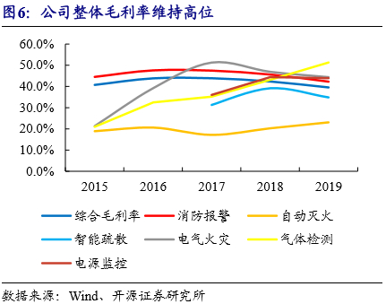 公司智能疏散业务实现爆发式增长,积极布局的工业消防、智慧消防等新业务有望成为新的增长点。2019年3月,住建部《消防应急照明和疏散指示系统技术标准》(GB51309-2018)开始实施,对不同场景下疏散指示方案作出了明确规定,并制定了疏散系统中各组成配件的准入标准。该政策的出台使得智能疏散系统的刚需属性大幅强化,直接推动市场需求的快速增长。公司智能疏散与防火门监控产品凭借与火灾自动报警及联动控制系统兼容性强、联动效应好的优势,实现了爆发式增长。2017至2019年公司智能疏散与防火门监控系统收入分别为0.4、0.8和1.7亿元,CAGR达67.8%,收入占比由2.7%提高至7.6%,即将成为公司第二大业务板块。