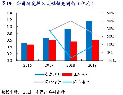 公司长期维持高水平的研发投入,成功自研“朱鹮”芯片助力降本增效。公司研发人员共有176人,占总员工数的7.23%,主要研发成员来自清华大学、中国科学技术大学、浙江大学等海内外名校,研发队伍实力业内领先。此外,公司长期维持高水平的研发投入,2017至2019年研发费用分别为0.66、0.93、1.16亿元,占营业总收入的比重分别为4.50%、5.22%、5.11%,研发费用复合增长率达32.6%。在高水平的研发团队和研发支出的支撑下,公司积累了众多技术成果,并逐步转化成产品优势。例如,公司自主研发的国内第一款消防报警专用芯片“朱鹮”集火灾探测能力、高带宽数字通讯能力于一体。与国内其它同行进口的通用芯片相比,“朱鹮”具备几大主要优势:(1)抗电磁干扰和抗湿热能力强、感烟探测器抗灰尘能力高、低误报;(2)消防报警对总线的要求高,“朱鹮”芯片可以提高总线带载距离和带载的器件数量,从而降低用户的总线成本;(3)“朱鹮”芯片可以根据需要集成多种功能,从而减少设计冗余,降低产品综合成本。可见,公司自主研发的“朱鹮”芯片不仅能提高产品性能,同时可以降低用户安装成本和公司生产成本(公司原材料成本中电子元器件成本占比超过70%)。目前第一代“朱鹮”芯片已开始应用,随着其应用范围的逐步拓展以及更高性能的二代芯片的升级,有望为公司实现降本增效,有助于公司进一步抢占市场份额。此外,公司目前已经大批量应用的主要核心技术还包括感烟探测器迷宫设计技术、感烟探测器本底补偿技术、独立式光电感烟火灾探测报警器等。在研项目主要有新一代点型感烟火灾探测器、青鸟无线广域网火灾报警系统、FireWatcher火灾报警系统等。其中,FireWatcher是一套自成体系的火灾探测报警系统,产品包括了探测器、警报设备、模块、控制器、配套附件等,已通过UL/ULC认证,能够在美国、加拿大、南美、中东等国家地区销售,充分展现了公司强大的研发实力。