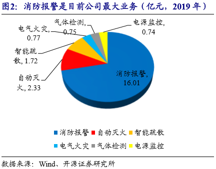 国内消防电子龙头,智能消防产品覆盖面广。青鸟消防业务涵盖火灾自动报警及联动控制系统、自动气体灭火系统、智能疏散与防火门监控系统、电气火灾监控系统、气体检测系统、电源监控系统等六大消防安全业务,产品结构丰富、种类齐全,覆盖从早期预警、报警到防火、疏散逃生与灭火的全链条。2019年公司上述业务收入分别达16.01、2.33、1.72、0.77、0.75、0.74亿元。