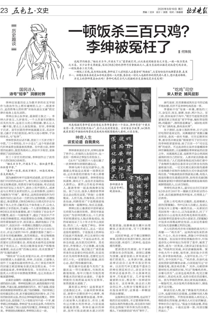 李绅吃鸡这事儿,最早应出自《百家讲坛》杂志在2007年一篇缺乏史料佐证的小文章,此后被演绎成各种版本,在网络上广泛流传。