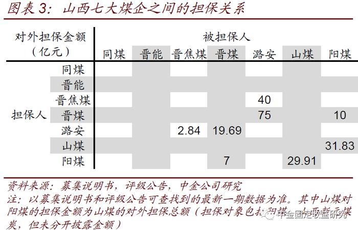 (5)此外山西七大煤企之间还存在一些担保行为和少量的交叉持股。如图表5,主要是潞安与晋煤和晋焦煤都有互保,阳煤与晋煤和山煤都有互保关系。持股方面,晋煤对阳煤控股子公司阳泉煤业集团融资再担保有限责任公司、阳泉煤业集团长沟煤矿有限责任公司、阳泉煤业集团兴峪煤业有限责任公司、新疆国泰新华化工有限责任公司四家子公司投资45亿元,相应的阳煤对晋煤的控股子公司也有投资45亿元,各自增加可供出售金融资产和少数股东权益。总体来看,晋东地区的三家煤企互保规模和较差持股现象都更典型一些。