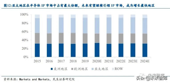 从地区分布看,亚太占据最大份额,预计未来仍将保持全球最高增速。亚太地区占据 了最大份额,2019 年约为 37%,预计未来仍将保持全球最快增速。据 Markets and Markets 数据显示,2018 年亚太地区在半导体 IP 市场中占据最大份额,且未来有望继续引领半导 体 IP 市场,成为增长最快的地区。其增长主要原因在于:1)全球最高的电子消费需求。亚太地区是电子产品的最大消费地区。因此,未来对半导体 IP 的需求还将持续增加,为半 导体 IP 市场的持续增长提供了动力。2)亚太地区半导体产能丰富。相比其他地区,亚太 拥有更多的半导体制造企业,晶圆制造一直被位于中国大陆,中国台湾,印度和新加坡的 公司所主导,许多主要的 IDM 企业都将晶圆生产外包给亚洲。据 IC Insights 数据,2019 年亚太地区(含中国)纯晶圆代工销售量达到 194.8 亿美元,市场份额 34.25%。3)政策 支持。亚太地区的政府机构投入了大量资金来扶持地方的半导体产业,促进了亚太地区依 赖 IP 的处理器、存储器和接口制造产业的发展。在这种市场背景下,越来越多的半导体 IP 厂商开始在该地区投资,促进了亚太地区的半导体 IP 市场增长。