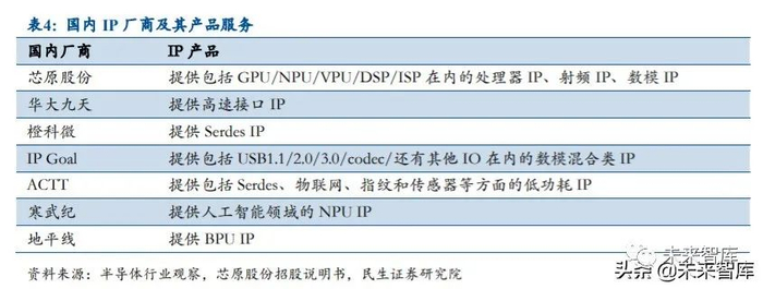 当前国产 IP 的产业影响力相对较小。目前中国大陆有芯原股份、寒武纪、华大九天、 橙科微、IP Goal 和 Actt 等 IP 厂商。其中芯原股份提供包括 GPU/NPU/VPU/DSP/ISP 在内 的处理器 IP、射频 IP、数模 IP;华大九天提供高速接口 IP;橙科微则是 Serdes IP 的供 应商;IP Goal 提供包括 USB1.1/2.0/3.0/codec/还有其他 IO 在内的数模混合类 IP;ACTT 的产品则包括 Serdes、物联网、指纹和传感器等方面的低功耗 IP。可以看出,国内厂商目 前提供的主要是接口 IP,其他诸如 CPU IP 的产出很少。但最近两年国产厂商在火热的人 工智能方面进展较快。以寒武纪为代表的国内厂商在 NPU IP 方面已有了较强的影响力;地 平线的 BPU IP 产品亦表现不俗。但总体来说,国内的 IP 产业依然较为薄弱,特别是 CPU 方面,还有待突破。