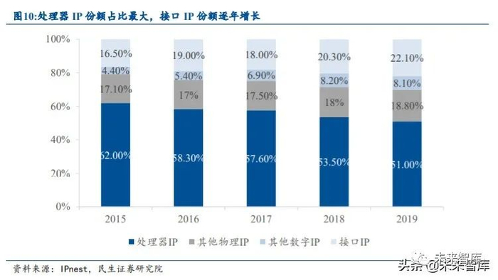 处理器 IP 份额最大,数据中心驱动接口 IP 成为最快增长品类。根据 IBS 数据,预计 处理器 IP、数模混合 IP、射频 IP、存储 IP 的市场规模将分别从 2018 年的 25.9 亿美元、 7.5 亿美元、5.4 亿美元、4.7 亿美元增长到 2027 年的 61.6 亿美元、14.2 亿美元、11.9 亿美元、8.1 亿美元,预计 2018 年到 2027 年 CAGR 分别为 9.04%,6.54%,8.13%,5.50%。过去十年智能手机的快速普及使得处理器 IP 份额迅速增长,虽然在近三年份额有所下降, 但 2019 年占比仍达 51%,为所有 IP 中份额占比最高的类别。而接口 IP 份额近年来逐步提 升,从 2015 年的 16.5%提升至 2019 年的 22.1%。2019 年接口 IP 的市场规模为 8.7 亿美元, 是 2009 年 2.2 亿美元的近 4 倍。“其他物理 IP”和“其他数字 IP”的份额也有所提升。