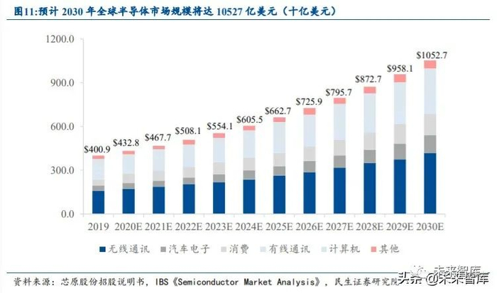 从应用领域看,消费电子和汽车行业的半导体 IP 市场将快速增长。半导体 IP 的应用 领域主要可分为消费电子、电信、工业、汽车、商业和其他(医疗、航空航天和国防等) 六大领域。由于智能手机 5G 换机潮、可穿戴设备需求增长以及市场对更高效、更快速、更可靠的处理器、存储和接口产品的需求量增加,消费电子领域的半导体 IP 预计将在未来以 较快的速度增长。此外,得益于汽车行业的数字化转型、车内娱乐信息系统的进步以及向 智能驾驶方向(ADAS)的演进,将会增加微处理器单元(MPU),微控制器单元(MCU), 传感器,模拟集成电路(IC),接口和存储器等的需求,预计汽车领域的半导体 IP 需求在 未来也将以较快的速度增长。根据 IBS 数据,预计全球半导体市场规模将从 2019 年的 4008.81 亿美元增至 2030 年的 10527.20 亿美元,年均复合增速达 9.17%。其中,以智能 手机为代表的无线通信市场;以自动驾驶、下一代信息娱乐系统为主要发展方向的汽车电 子市场;以及包括电视、视听设备和虚拟家庭助理在内的消费类应用将快速增长。
