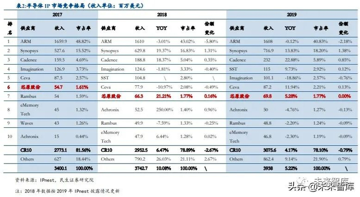 IP 行业竞争格局高度集中,19 年 CR10 占比 78.1%,且龙头企业地位稳固。IPnest 数 据显示,2019 年半导体 IP 前十大厂商实现营收 30.76 亿美元,同比增长 4.17%,市场份额 高度集中,达到 78.1%。2017 年以来,前十大厂商中除了 SST 凭借 NVM IP 的强势表现异军 突起外(2019 年排名第四),其他 9 家厂商始终位列前十,且 ARM、 Synopsys、 Cadence 过去几年始终位居行业前三,龙头企业地位稳固,强者恒强。另一方面,前十大 IP 厂商中 仅排名第 7 的芯原股份为大陆厂商,IP 国产化需求十分迫切。