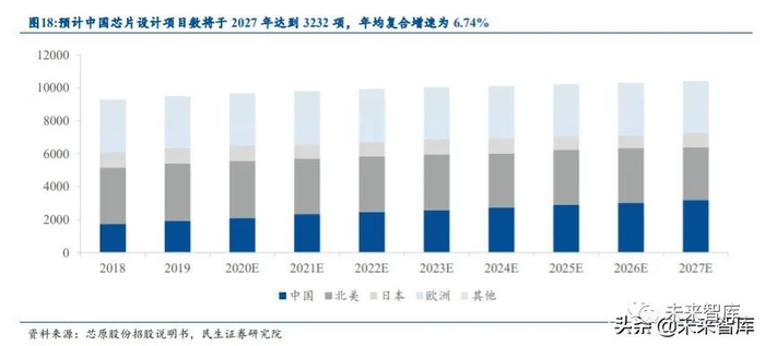 中国芯片设计项目数量同样快速增加。由于中国大陆芯片设计公司的不断崛起,本土 设计项目在全球设计项目中的占比不断增高。根据 IBS 报告,2018 年中国芯片设计公司规 划中的设计项目数为1797项,该数据预计将于2027年达到3232项,年均复合增速达6.74%。