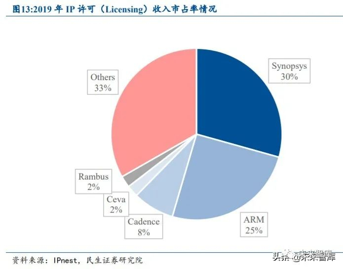 IP 许可收入前 5 大厂商市占率高达 66.70%。单看半导体 IP 许可收入竞争情况,2019 年 Synopsys 市占率为 29.3%,排名行业第一,ARM 市占率为 25.2%,排名第二,Cadence、 Ceva、 Rambus 分列 3、4、5 位,前 5 名厂商的市占率合计为 66.70%,行业集中度高。