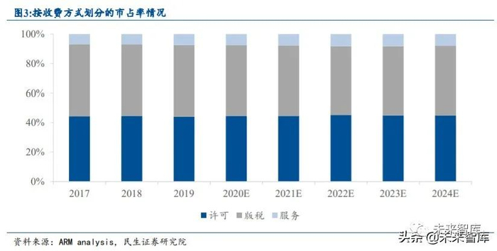 按收费方式分类,IP 商提供许可和版税两种模式,其中版税占据较大份额。在许可 (Licensing)模式下,设计商按 IP 授权次数付费,是一次性产品授权费。在版税(Royalty) 模式下,设计商按制造的芯片数量付费,是跟产品销量挂钩的授权费。2019 年版税收费方 式占比近半,由于未来市场技术更新迭代迅速,预计版税模式仍将盛行。从全球 IP 龙头 ARM 公司的收入结构来看,约 2/3 为版税收入,而许可收入仅占 1/3 左右。此外,ARM 的营收还包括软件工具以及技术支持的服务收入。一般来说,一次性技术授权费用在 100 万 -1000 万美元之间,版税提成比例在 1%-2%之间。