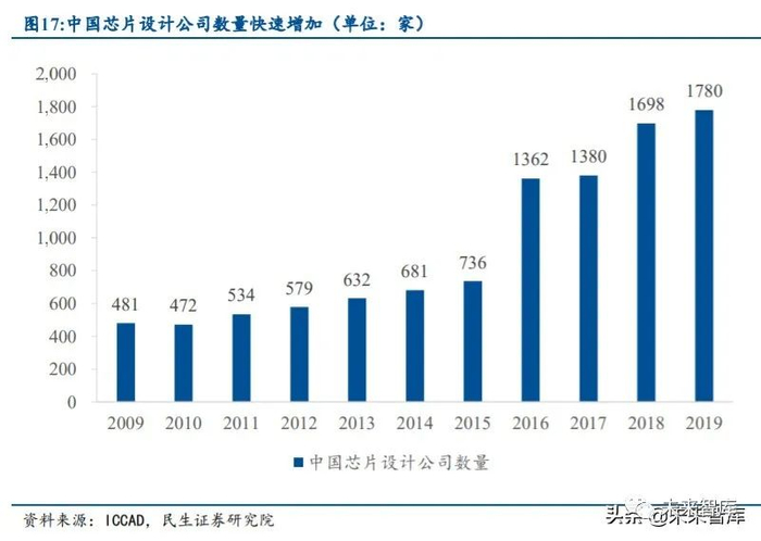 竞争格局逐步改善,中国大陆芯片设计公司数量已呈快速增长趋势。随着中国芯片制 造及相关产业的快速发展,本土产业链逐步完善,为中国的初创芯片设计公司提供了国内 晶圆制造支持,加上产业资金和政策的支持,以及人才的回流,中国的芯片设计公司数量 快速增加。据 ICCAD 数据显示,自 2016 年以来,我国芯片设计公司数量大幅提升,2015 年仅为 736 家,2019 年则增长至 1780 家,年均复合增长率为 24.71%。