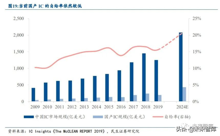 预计未来中国大陆的半导体市场份额将快速提升。当前全球半导体产业正在经历从美 国到日韩、从日韩到中国台湾、从中国台湾到中国大陆后的第三次产业转移,未来 IC 国产 自给率有望快速提升,据 IC Insights 预计 2024 年我国国产 IC 自给率有望达到 20.67%。