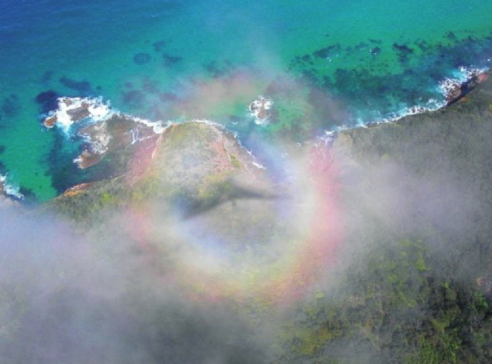 观云者必须要去一些高的地方,因为这种引人注目的现象只有在太阳正位于你身后、将你的影子投射到云层上时才能看到。宝光看上去像是影子周围的一系列彩虹环,尽管我们还没能完全了解其中精确的光学,但它确实是云滴反射、折射和衍射太阳光形成的。
