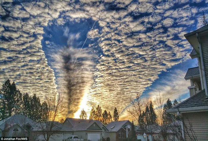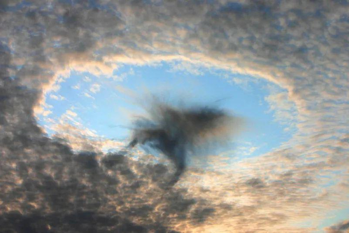 雨幡洞云也被称为“穿孔云”,是中云族或高云族云层中脆弱的裂口,其下方悬吊着冰晶拖尾。