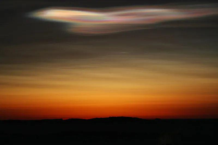 贝母云,有时被称为“珠母云”,形成于距地面16—32千米、温度为零下85摄氏度的平流层,当太阳刚刚落下地平线时,云层散射太阳光,就会呈现出美丽、柔和的彩虹色调。